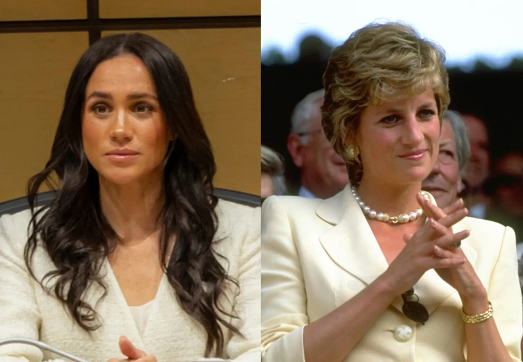 В рамках официальной поездки на Ближний Восток Меган и Гарри приняли участие в круглом столе ВОЗ. Для этой встречи 44-летняя Маркл выбрала двубортный твидовый жакет кремового цвета, который она дополнила майкой и широкими брюками такого же оттенка. В сети обратили внимание на то, что при выборе наряда герцогиня вновь вдохновилась принцессой Дианой, которая тоже выходила в свет в похожем образе.