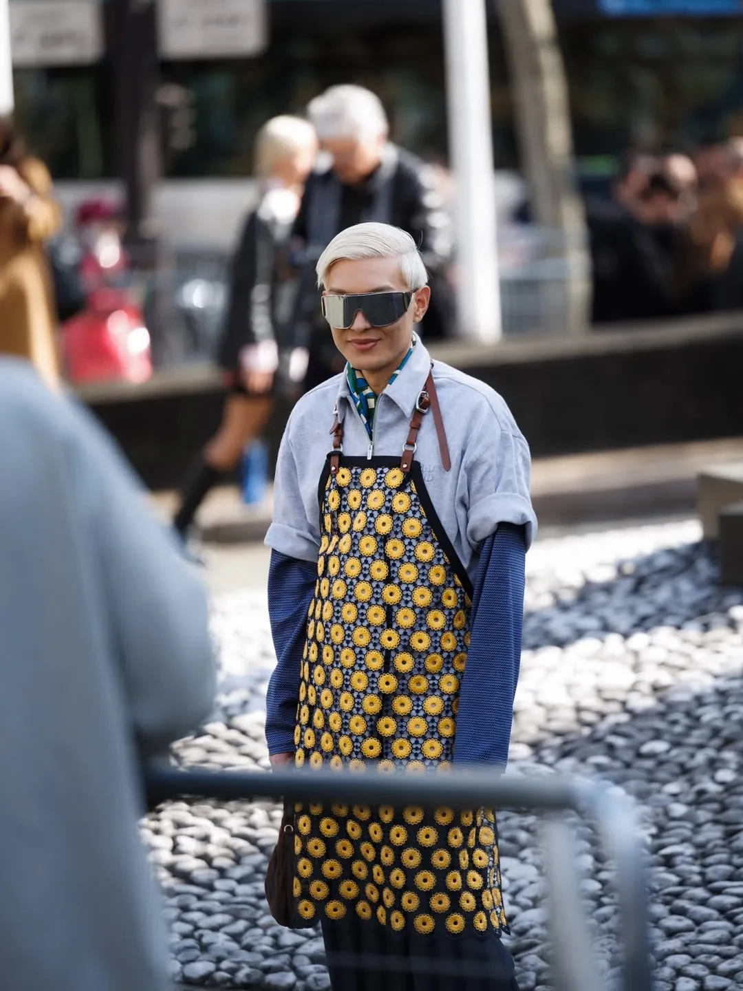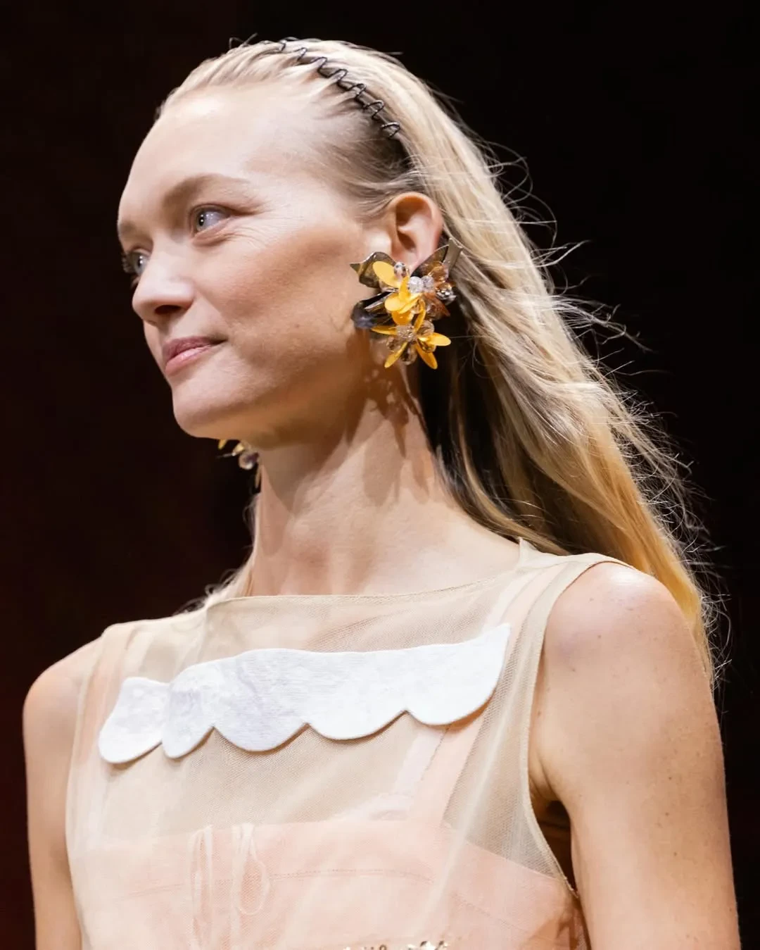 39-летняя Елена Перминова надела платье с цветочным принтом, а 37-летняя Оксана Самойлова пришла в мини-юбке и чулках. Ксения Шипилова примерила кожаный фартук из предыдущей коллекции бренда, посвящённой женщинам-работницам.
