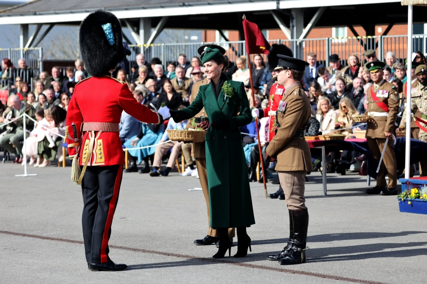 Принцесса Уэльская Кейт Миддлтон посетила традиционный парад Ирландской гвардии в честь Дня святого Патрика в Олдершоте (Хэмпшир). Это стало её вторым официальным участием в мероприятии после возвращения к обязанностям после болезни.