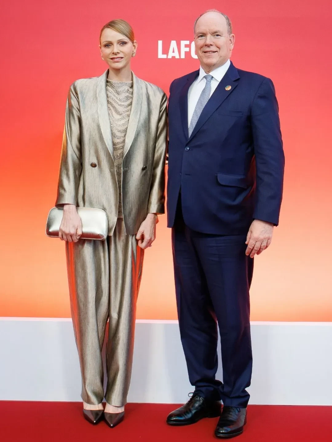 Для выхода в свет 48-летняя Шарлен выбрала свободный золотой костюм от Armani. Образ она дополнила клатчем La Prima, лодочками в тон и акцентными серьгами. Альбер, как и подобает, был в классическом синем костюме. Во время церемонии супруги держались за руки, опровергая слухи о проблемах в браке, а также охотно позировали фотографам.