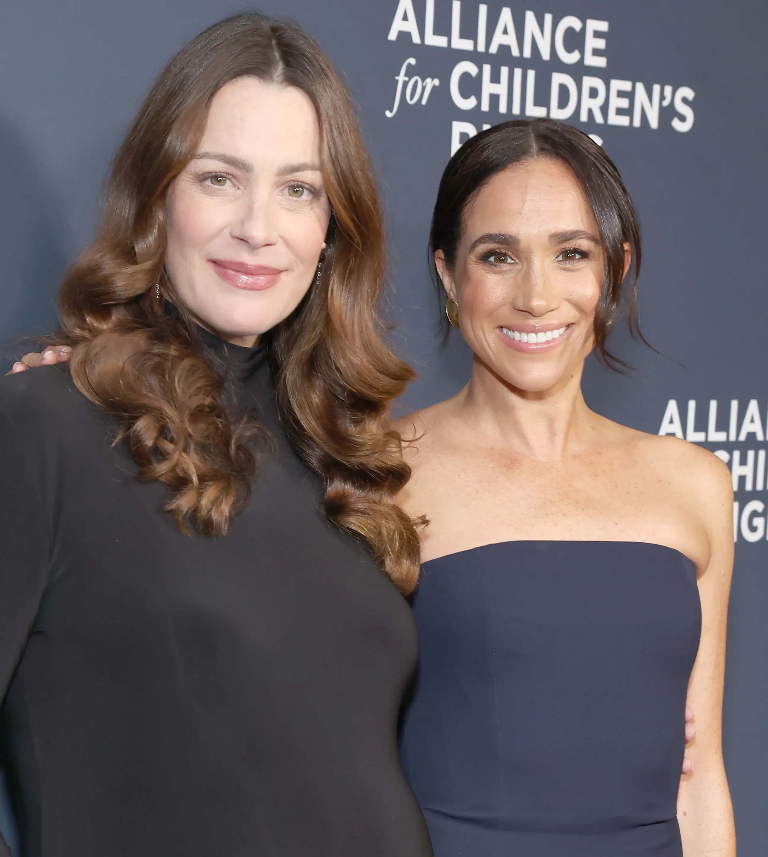 44-летняя супруга принца Гарри позировала в платье-бандо тёмно-синего цвета и золотых серьгах рядом с беременной подругой (несколько лет назад она потеряла девятилетнего сына).