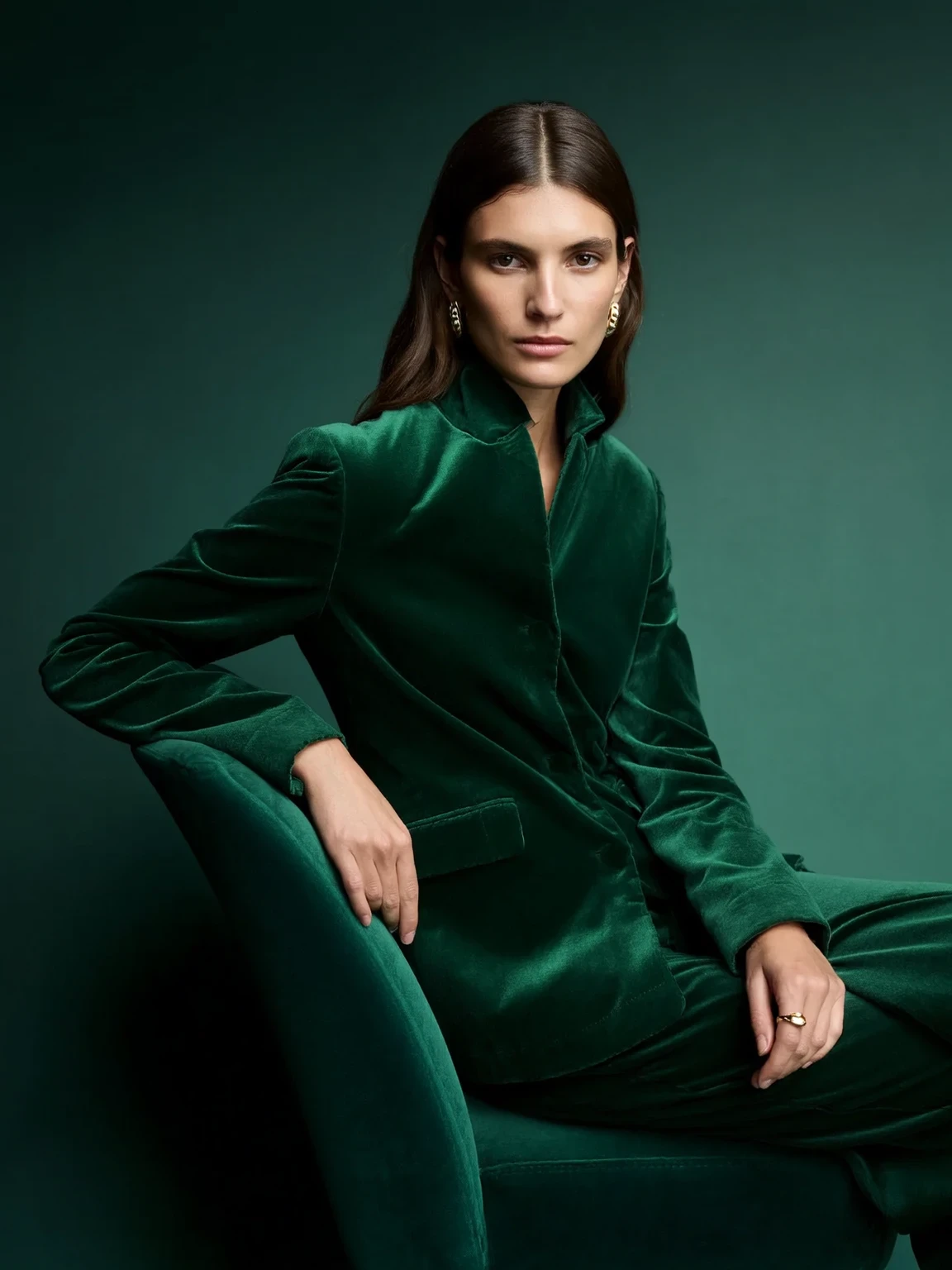 Чтобы костюм не выглядел слишком буднично, выбирай ткани с лёгким блеском — бархат, сатин или костюмную шерсть. Под пиджак можно надеть шелковую майку, топ с открытыми плечами или тонкую водолазку. Добавь яркие украшения и клатч — и образ готов для праздника.