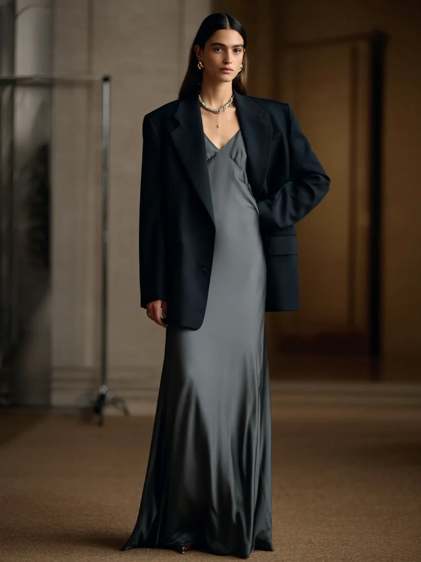 Платье-комбинация — символ современной женственности. Модель из сатина, шелка или люрекса придаёт образу мягкое сияние, а в сочетании с жакетом или коротким кардиганом становится идеальным для корпоратива.