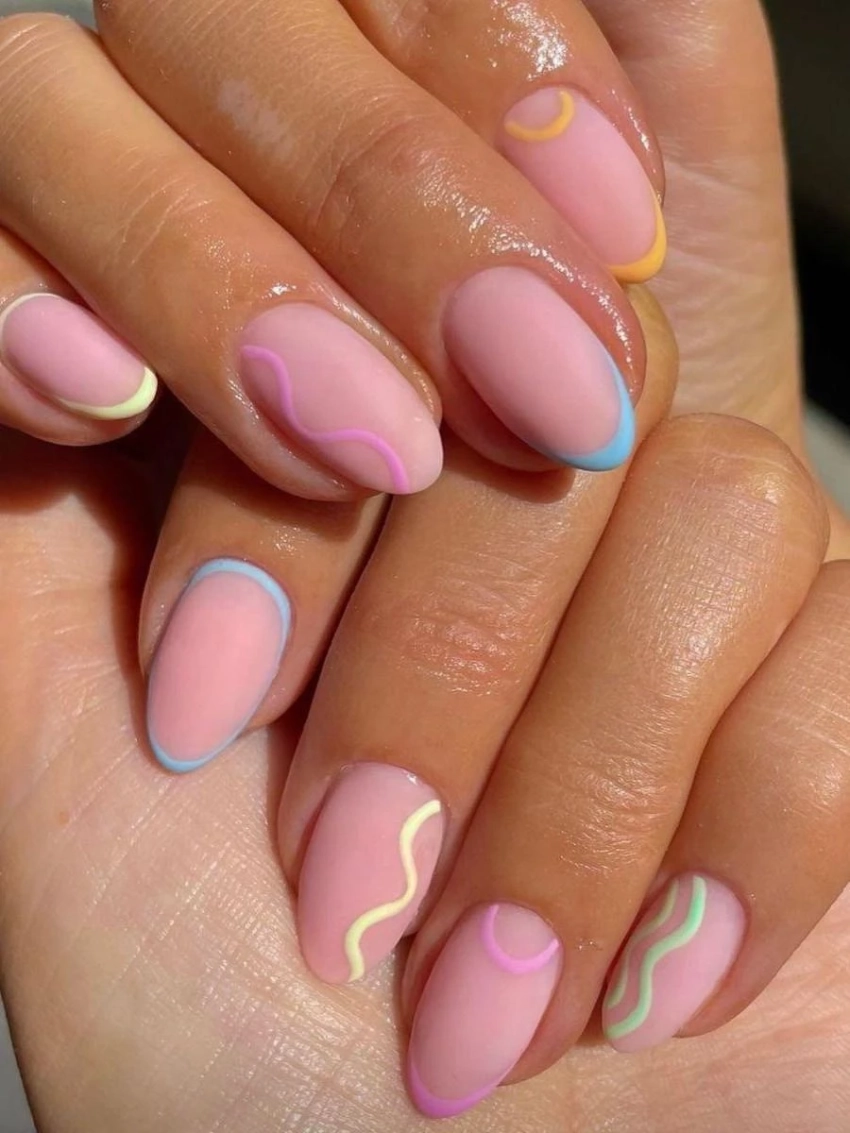 Тонкие полосы в молочно-бежевой, оливковой или сероватой гамме создают аккуратную геометрию. Такой маникюр выглядит свежо, но спокойно, идеально балансируя между выразительностью и простотой.