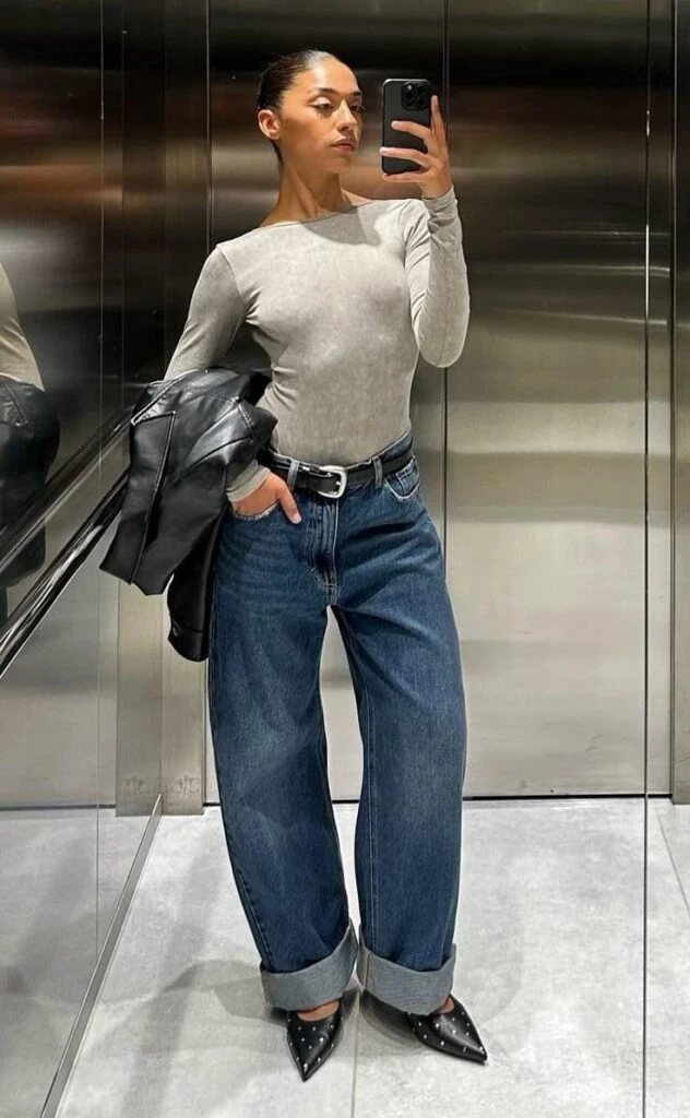 Чтобы образ выглядел гармонично, стилисты советуют сочетать объемный низ с более облегающим верхом — например, топом, водолазкой или заправленной рубашкой. Обувь на каблуке или платформе поможет визуально вытянуть силуэт, особенно если джинсы широкие по всей длине.