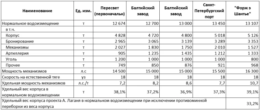 Но вернемся к проектам Балтийского завода и А. Лаганя. То, что французский броненосец оказался на 400 (если быть точным, то на 407) т тяжелее – это лишь половина дела. Потому что еще на 402,4 т французский кораблестроитель выиграл на экономии весов по разным статьям нагрузки, снизив таковые относительно проектного задания.