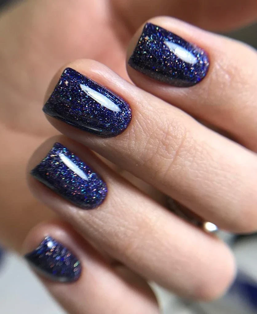 Синие ногти с блестками выглядят как звездное небо. Такой дизайн легко дополнить эффектом «галактика».