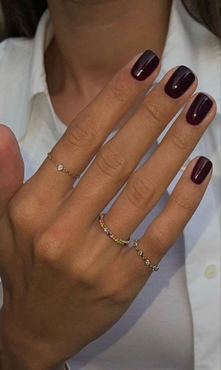 Сливовый оттенок с мерцающим блеском похож на драгоценный камень. Маникюр самодостаточен и не требует дополнительных украшений.