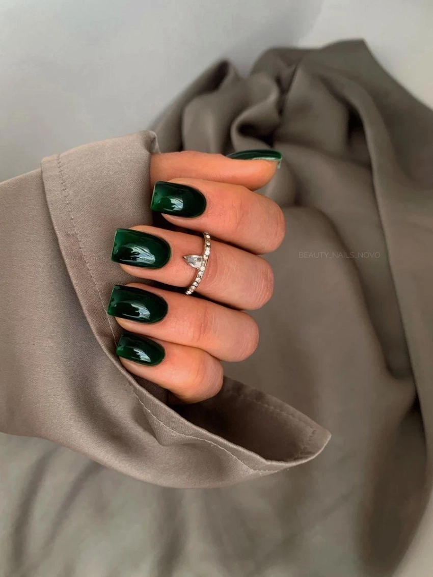 Глубокий зеленый в глянцевом исполнении — выбор смелых натур. На коротких ногтях этот оттенок смотрится особенно элегантно.