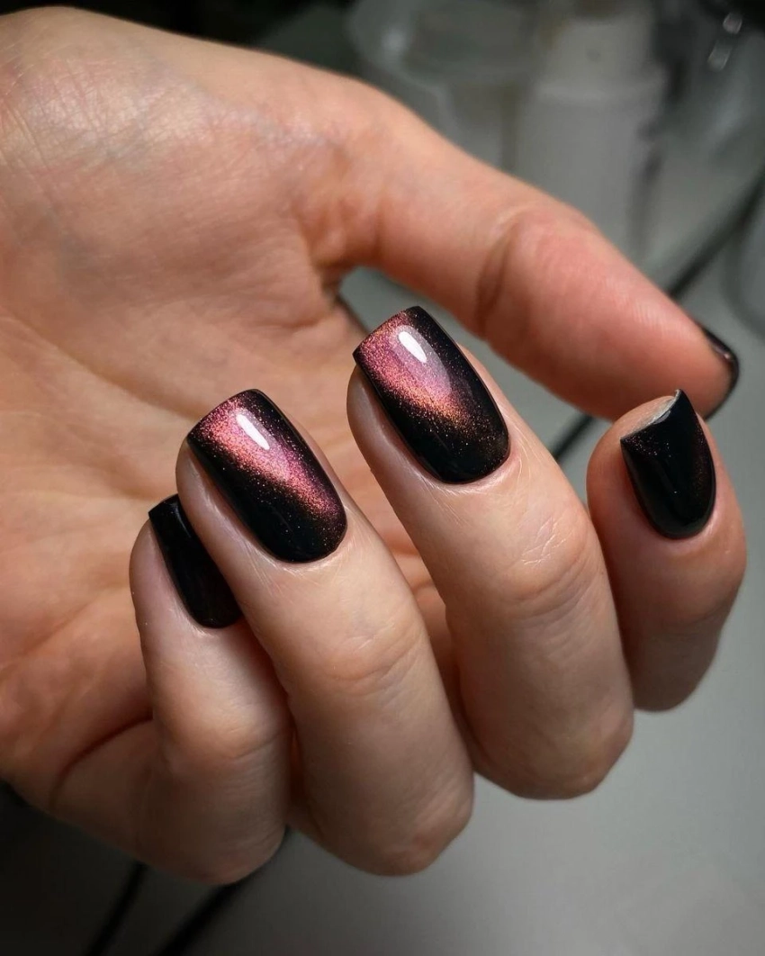 Магнитное покрытие с мерцающим бликом делает маникюр загадочным и роскошным.