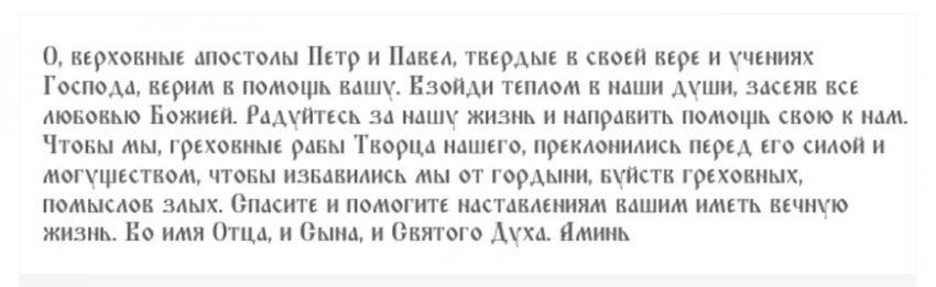 Начните день с участия в праздничной литургии. Обратитесь с молитвой к Петру и Павлу, прося их заступничества, помощи в делах, душевного укрепления и духовного просвещения.