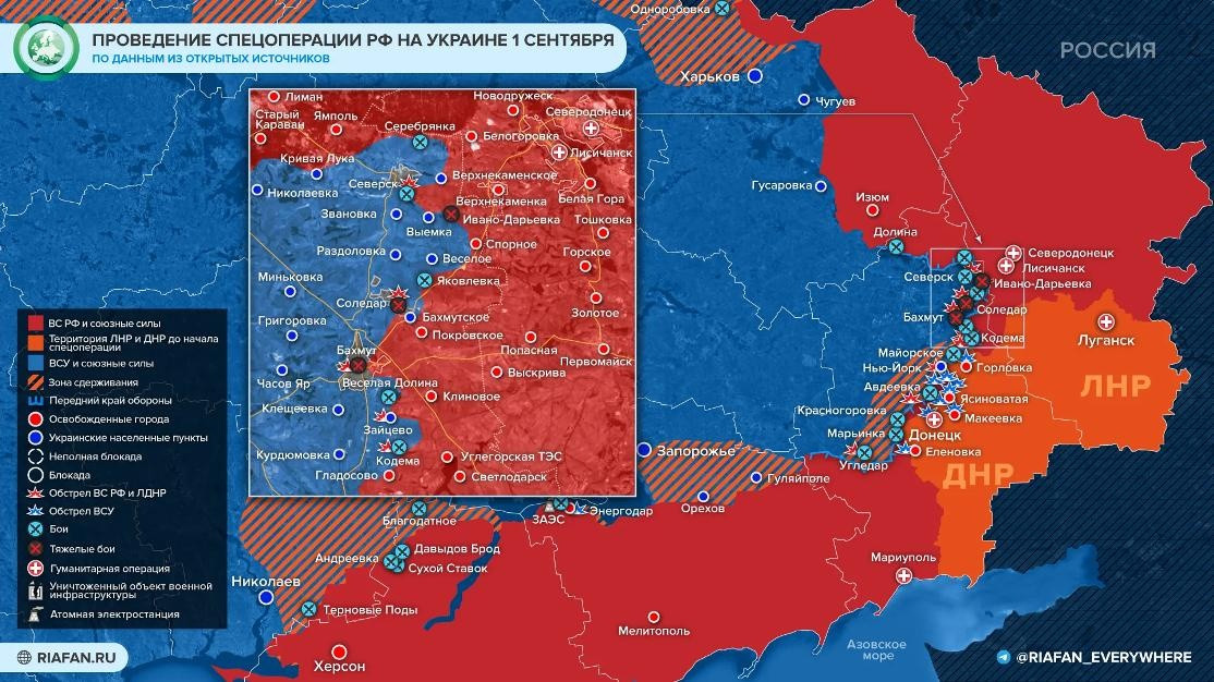 Представленная 01.09.2022 РИА ФАН карта боевых действий на Украине отражает основные события в рамках специальной военной операции России, направленной на защиту населения Донбасса.
