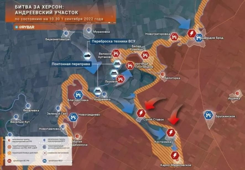 Всего на участке Андреевка — Лозовое — урочище Плотницкое наведено три понтонные переправы, через которые ведётся снабжение группировки ВСУ на южном берегу Ингульца.