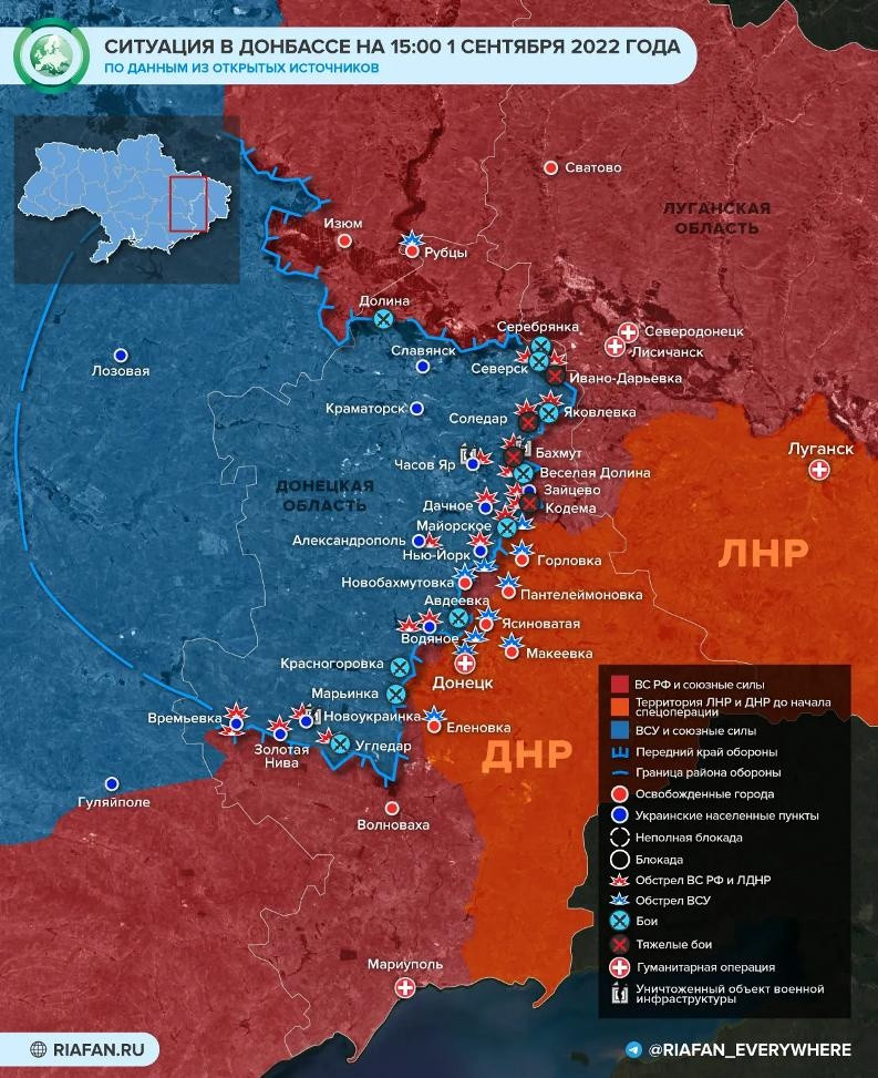 Сегодня, 01.09.2022, свежая карта боевых действий на Украине была представлена РИА ФАН. Она отражает основные события, которые происходят в рамках специальной военной операции, которая направлена на демилитаризацию и денацификацию.