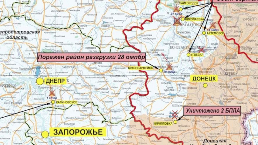 Продолжается нанесение ударов оперативно-тактической и армейской авиацией, ракетными войсками и артиллерией по военным объектам на территории Украины. Высокоточными ракетами наземного базирования «Искандер» нанесен удар по живой силе и военной технике 28-й мотопехотной бригады ВСУ во время выгрузки на железнодорожной станции Красноармейск ДНР. В районе населённого пункта Миролюбовка Херсонской области в результате ударов армейской авиации ВКС России по подразделениям 60-й пехотной бригады ВСУ уничтожено свыше 50 военнослужащих и 7 единиц военной техники.