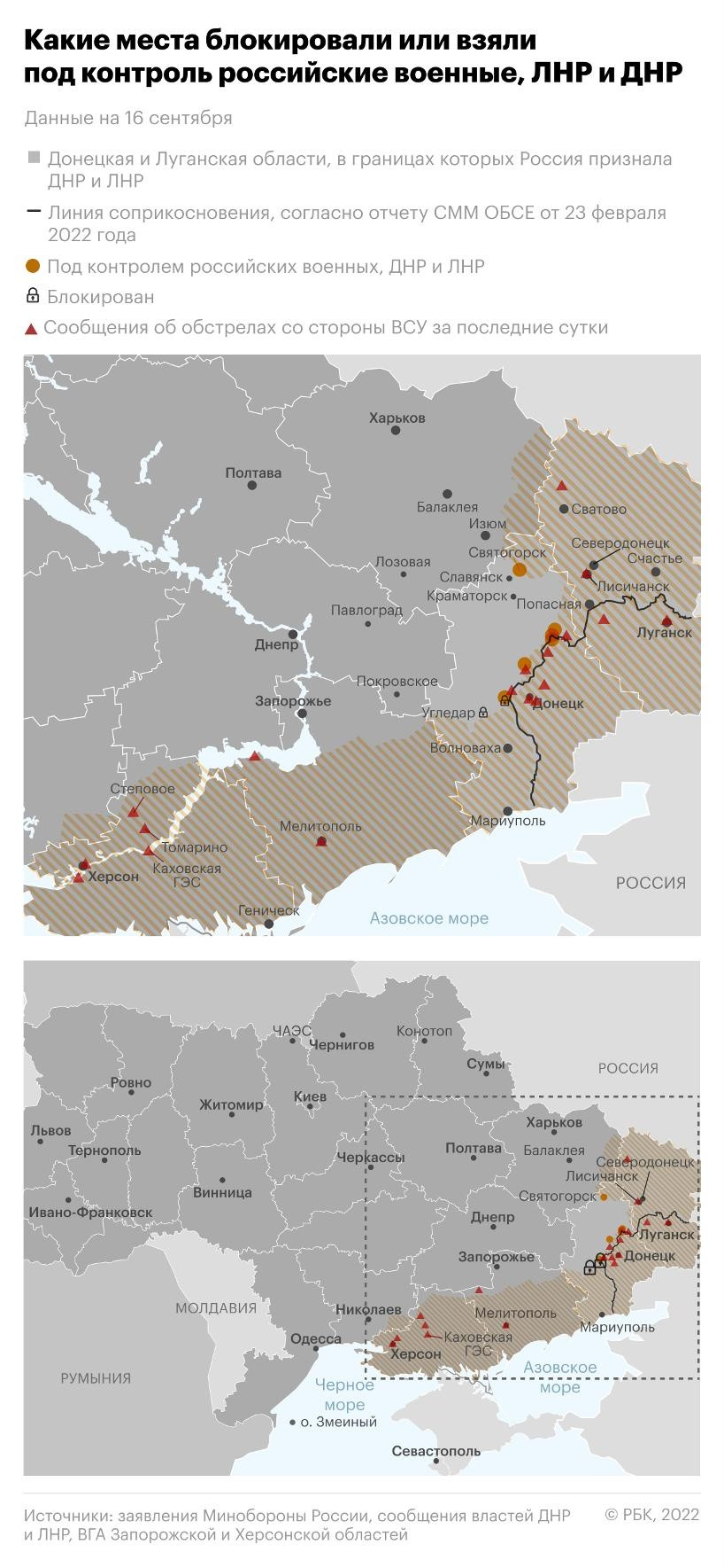 Представленная накануне РБК карта боевых действий на Украине не потеряла свою актуальность сегодня, 17.09.2022. На ней отражены основные события в рамках специальной военной операции, направленной на защиту Донбасса, а также демилитаризацию и денацификацию Украины.
