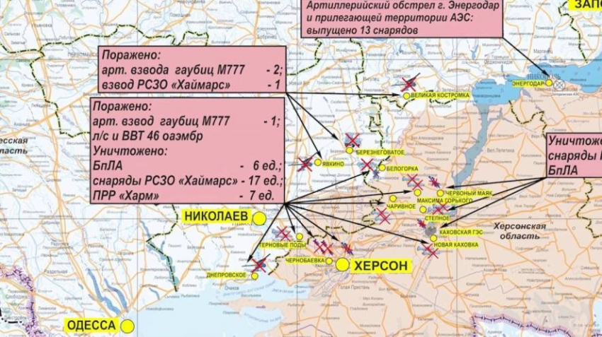 ПВО сбиты 17 БПЛА, в уничтожено 37 снарядов РСЗО, в т.ч. 27 снарядов HIMARS и 10 снарядов «Ольха». Также сбиты 7 американских ракет «HARM».