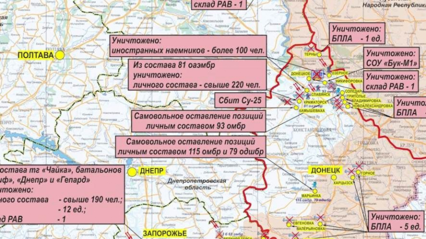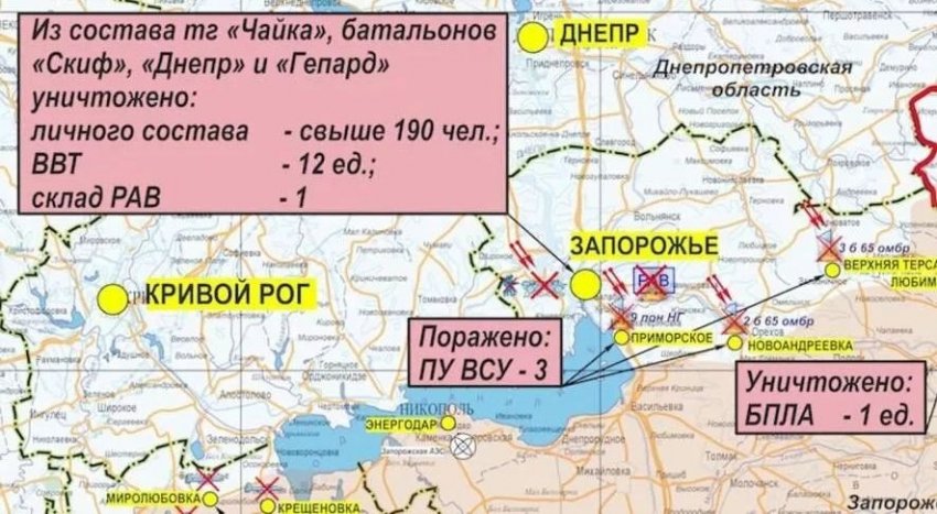 Нанесены удары по нацбатам «Скиф», «Днепр» и «Гепард», а также по тактической группе «Чайка» в районе Запорожья, ликвидировано свыше 190 боевиков и 12 единиц военной техники.