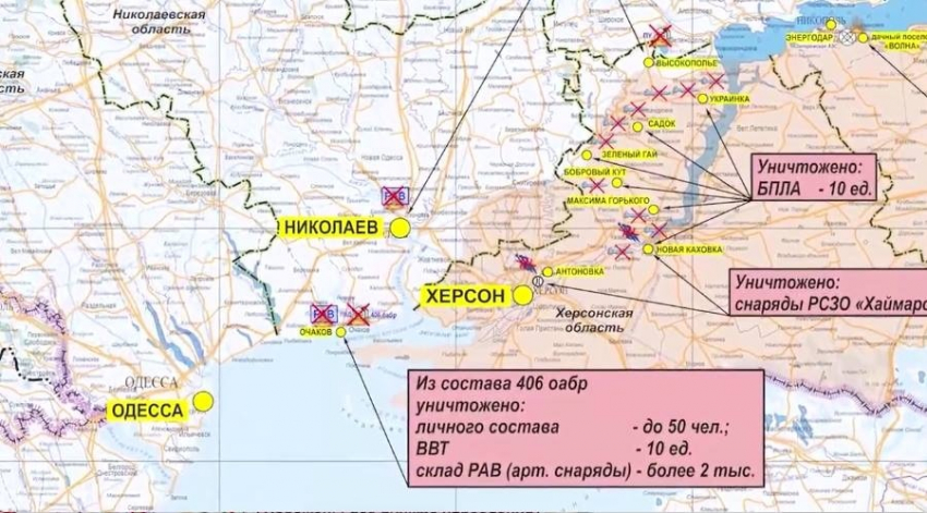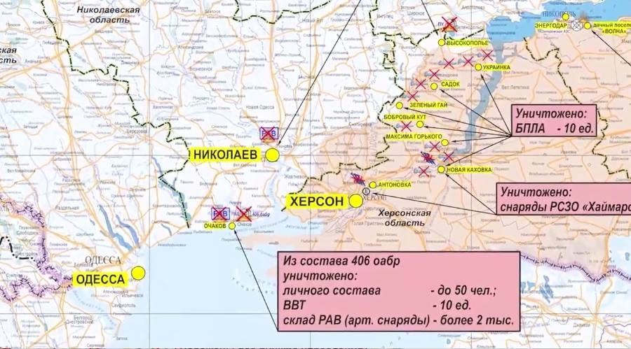 До 50 украинских боевиков были уничтожены высокоточным ударом в районе Очакова (Николаевская область). ВСУ лишились 10 единиц военной техники и более двух тысяч артиллерийских снарядов. Кроме того, истребительная авиация ВКС РФ сбила самолет Су-24 ВВС Украины.