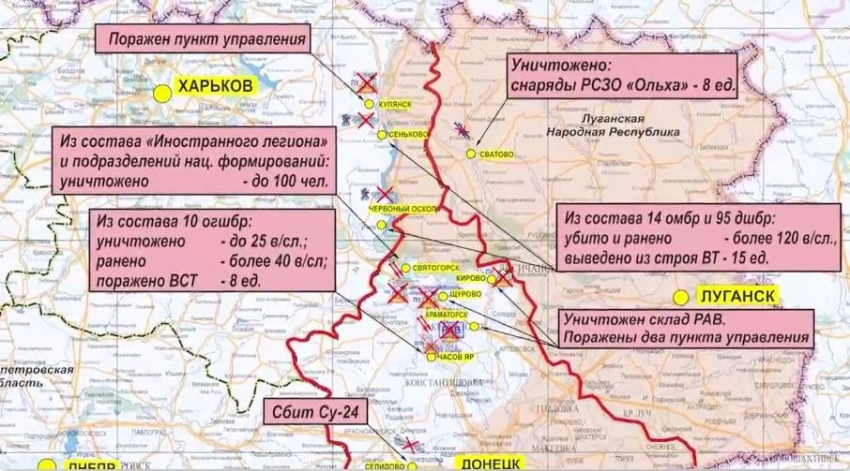 Министерство обороны РФ в ходе ежедневного брифинга сообщило о ликвидации до 100 боевиков в результате высокоточных ударов ВКС РФ по пунктам временной дислокации «Иностранного легиона» и подразделений националистических формирований в районе населенного пункта Святогорск в Донецкой Народной Республике (ДНР).