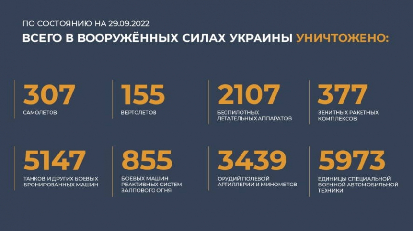 Всего с начала проведения специальной военной операции уничтожено: 307 самолетов, 155 вертолетов, 2107 беспилотных летательных аппаратов, 377 зенитных ракетных комплексов, 5147 танков и других боевых бронированных машин, 855 боевых машин реактивной системы залпового огня, 3439 орудий полевой артиллерии и минометов, а также 5973 единицы специальной военной автомобильной техники.