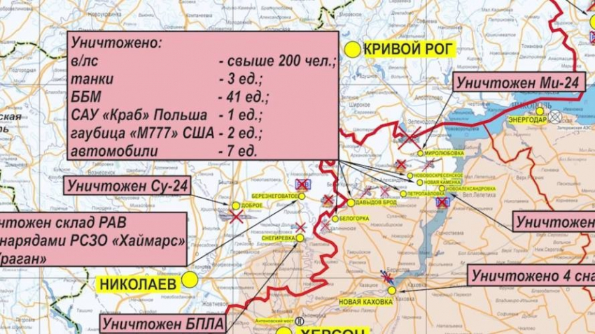 Ударами авиации, ракетных войск и артиллерии поражен пункт управления ВСУ в районе Дробышево. Уничтожен склад украинских войск в районе Вольного Поля. В районах Кирово и Дробышево ликвидированы 2 американские радиолокационные станции контрбатарейной борьбы (AN/TPQ-37).
