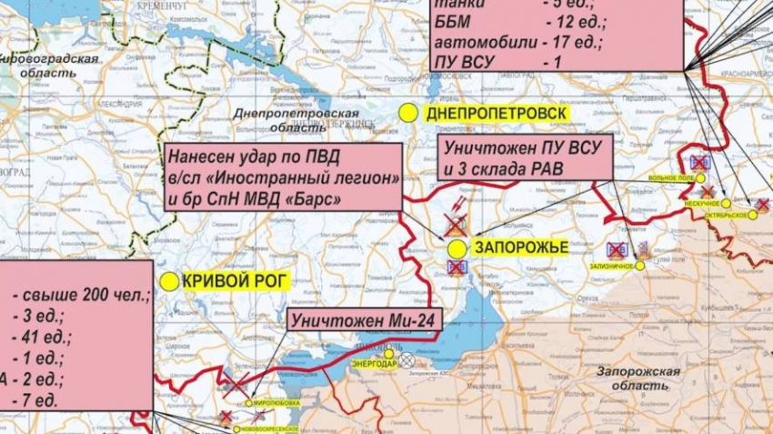 ВКС РФ нанесли удары по пунктам временной дислокации наемников «Иностранного легиона» на острове Хортица и бригады спецназначения «Барс» МВД Украины в районе Запорожья.
