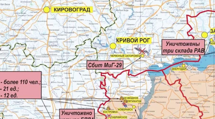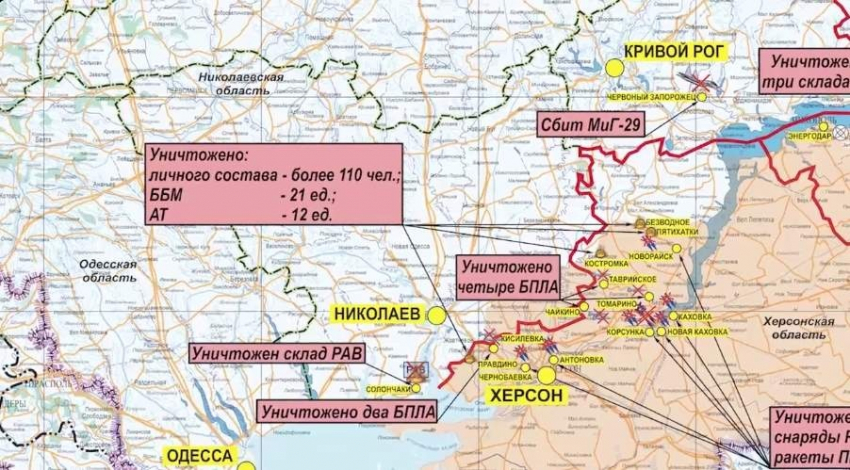 На Николаево-Криворожском направлении ВСУ наступали силами до 2 батальонных тактических групп в направлении Пятихаток, Костромки, Безводного и Правдино (Херсонская область). Все атаки отражены, уничтожено более 110 военнослужащих, 21 боевая бронемашина и 12 специальных автомобилей.