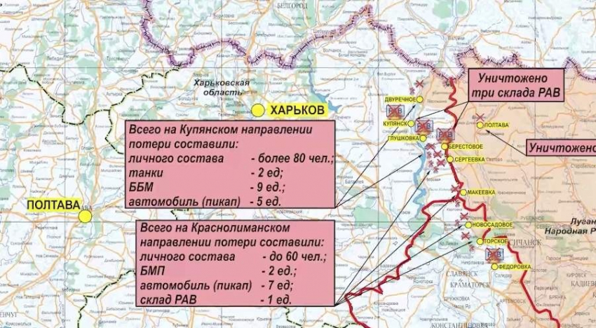В районе населенного пункта Берестовое Харьковской области огнем артиллерии уничтожено до 50 украинских военнослужащих, два танка, пять боевых бронированных машин, три автомобиля, а также полевой склад с боеприпасами.