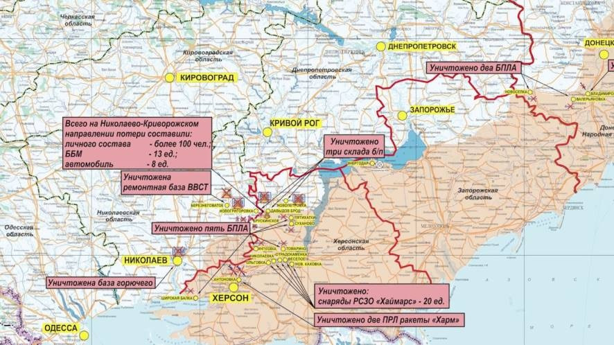 Ударами оперативно-тактической и армейской авиации, ракетных войск и артиллерии за сутки поражены два пункта управления в районах населенных пунктов Двуречная Харьковской области, Дробышево Донецкой Народной Республики, 39 артиллерийских подразделений на огневых позициях, живая сила и военная техника в 127-ми районах. Уничтожено шесть складов боеприпасов в районах населенных пунктов Фиголевка Харьковской области, Верхнекаменское, Соледар Донецкой Народной Республики, Новогригоровка Николаевской области, Новопетровка и Давыдов Брод Херсонской области. В районе города Николаев уничтожено хранилище топлива для военной техники ВСУ. Кроме того, в районе населенного пункта Березнеговатое Николаевской области уничтожена ремонтная база вооружения и техники ВСУ, сообщает "Глас Народа".
