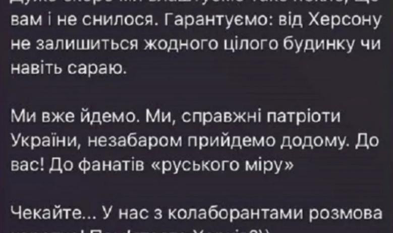 «Внимание! Граждане Херсона! «Очень скоро мы устроим вам такой ад, который вам и не снился. Обещаем, от Херсона не останется ни одного дома или даже сарая. Мы уже идем. Мы, настоящие патриоты Украины скоро придем домой. К вам! К фанатам «русского мира». Ждите… У нас с коллаборантами разговор короткий! Помните Харьков?))», — так дословно переводится содержание угрожающего сообщения.
