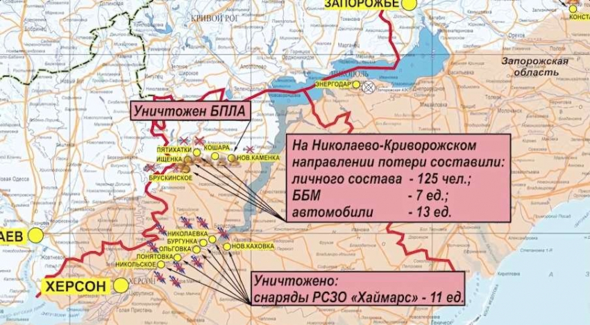 На Николаево-Криворожском направлении противник силами до двух батальонных тактических групп предпринимал безуспешные попытки атаковать в направлениях населенных пунктов Ищенка, Брускинское, Пятихатки и Кошара Херсонской области. В результате нанесения поражения уничтожено до 125 украинских военнослужащих, семь боевых бронированных машин и 13 автомобилей.