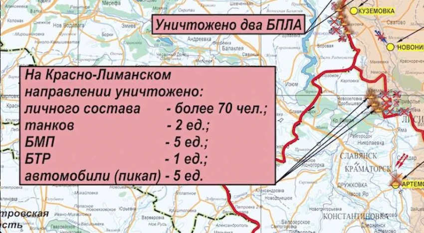 На Красно-Лиманском направлении активными действиями подразделений российских войск уничтожено более 70 украинских военнослужащих, два танка, пять боевых машин пехоты, бронетранспортер и пять пикапов.