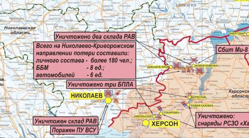 На Николаево-Криворожском направлении в течение суток сосредоточенным огнем российской артиллерии и ударами армейской авиации наносилось поражение выдвигавшимся из глубины резервам украинских войск, а также диверсионным группам у линии боевого соприкосновения. Уничтожено более 180 украинских военнослужащих, восемь боевых бронированных машин и шесть автомобилей.