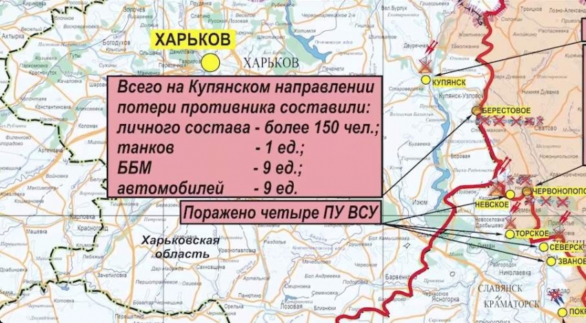 На Красно-Лиманском направлении две батальонные тактические группы ВСУ вели наступательные действия в направлении населенного пункта Червонопоповка Луганской народной республики. Активными действиями российских войск противник остановлен. Огнем артиллерии и ударами армейской авиации уничтожено более 50-ти украинских военнослужащих, два танка, три боевых бронированных машины и два автомобиля.