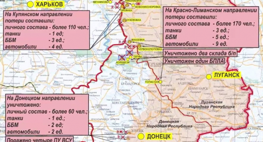 На Купянском направлении подразделения российских войск нанесли поражение двум ротным тактическим группам ВСУ, а также двум формированиям иностранных наемников в районах населенных пунктов Орлянка Харьковской области, Николаевка и Куземовка Луганской Народной Республики. Уничтожено более 110 украинских военнослужащих и боевиков, один танк, три боевые бронированные машины, два пикапа и два автомобиля.