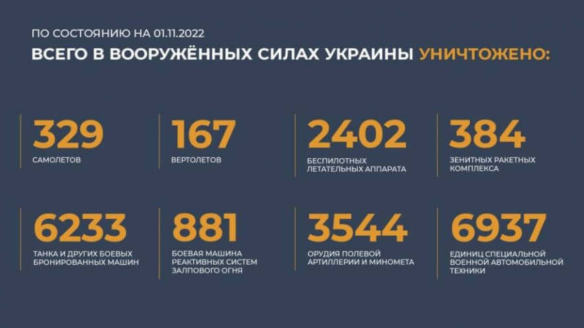 Всего с начала проведения специальной военной операции уничтожены: 329 самолетов, 167 вертолетов, 2402 беспилотных летательных аппарата, 384 зенитных ракетных комплекса, 6233 танка и других боевых бронированных машин, 881 боевая машина реактивных систем залпового огня, 3544 орудия полевой артиллерии и минометов, а также 6937 единиц специальной военной автомобильной техники.