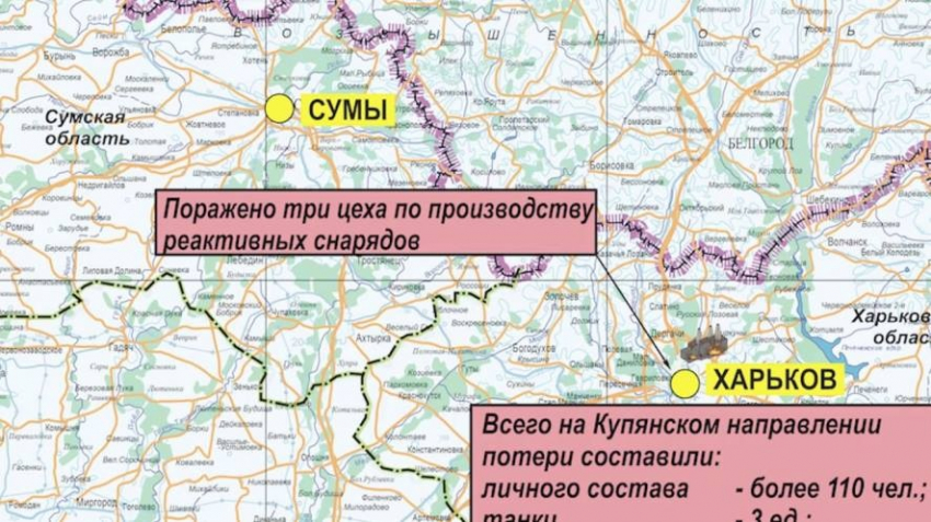 На Купянском направлении в результате активных действий российских войск сорваны попытки противника атаковать двумя ротными тактическими группами в направлении населенных пунктов Берестовое Харьковской области и Куземовка Луганской Народной Республики. Огнем российской артиллерии и армейской авиации противнику нанесено поражение. Подразделения ВСУ отброшены на исходные рубежи. Уничтожено более 110-ти украинских военнослужащих, три танка, две боевые бронированные машины, пять пикапов, 14 бронеавтомобилей «Хамви» и «Козак».